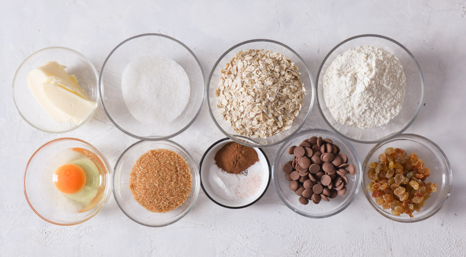 Отмерьте продукты на весах. Вам понадобятся пшеничная мука, овсяные хлопья (не долгой варки), соль, разрыхлитель, корица. Их можно сразу отмерить в одну миску и перемешать. Также понадобится сахар. Я использовала 2 вида: белый и тростниковый. Если тростникового нет, замените на обычный. Но тростниковый сахар делает печенье невероятно ароматным. Подойдет сливочное масло, жирностью и 72.5 % и 82.5 %. Главное, чтобы в составе отсутствовали заменители молочного жира, и на упаковке был указан ГОСТ 32261-2013. И еще масло должно быть комнатной температуры. Требований к яйцам нет. Я составила рецепт так, чтобы Вы использовали одно яйцо категории С1. Остальные продукты - это добавки. Тут Вы можете выбрать свое. У меня молочный шоколад и изюм.
