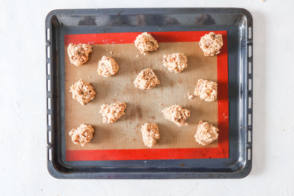 Теперь руками скатайте шарики и прижмите ложкой, чтобы получились более плоские печенья. Не стоит на одном противне размещать заготовки вплотную друг к другу. Во время выпечки тесто расплывется и заполнит пространство вокруг.