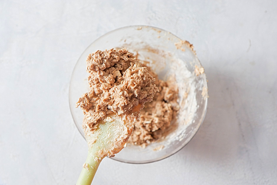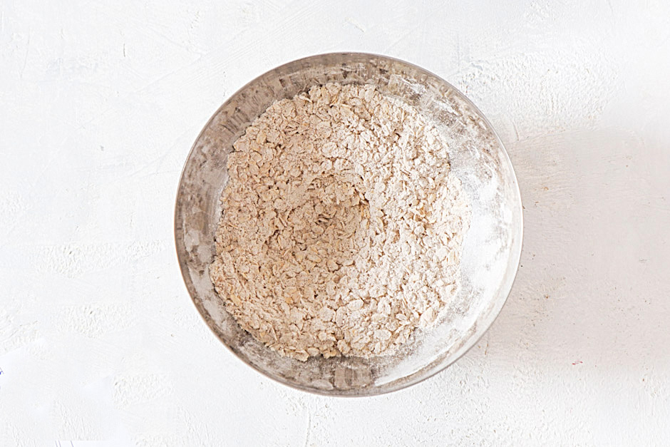 Я отмерила все ингредиенты по отдельности, чтобы Вы увидели их все. Сухие ингредиенты смешайте вместе: муку, овсянку, разрыхлитель, соль и специи (корицу).