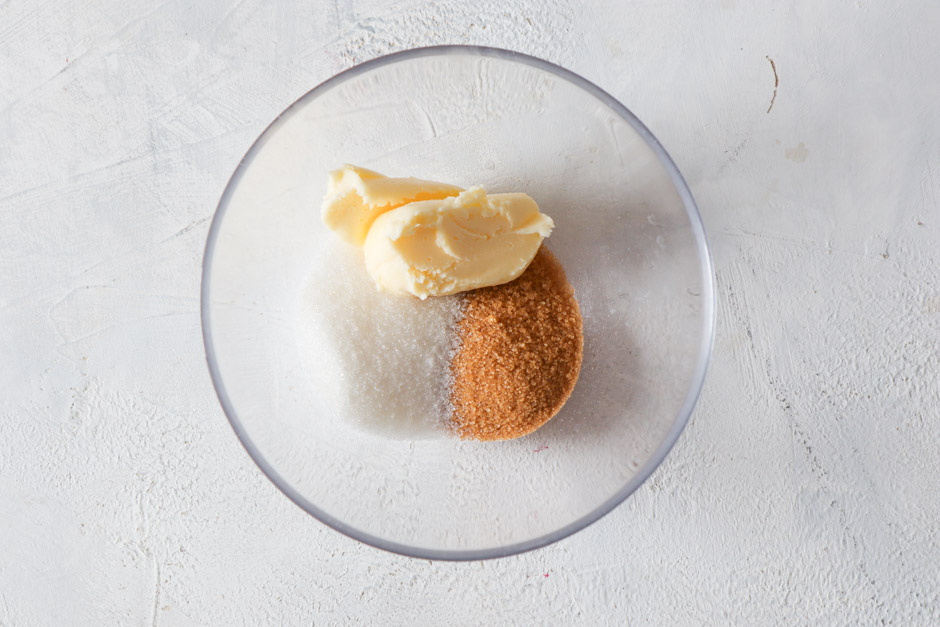В другой миске соедините сливочное масло и сахар. Взбивайте миксером, мягкое масло легко соединится с сахаром и превратится в кремообразную массу.