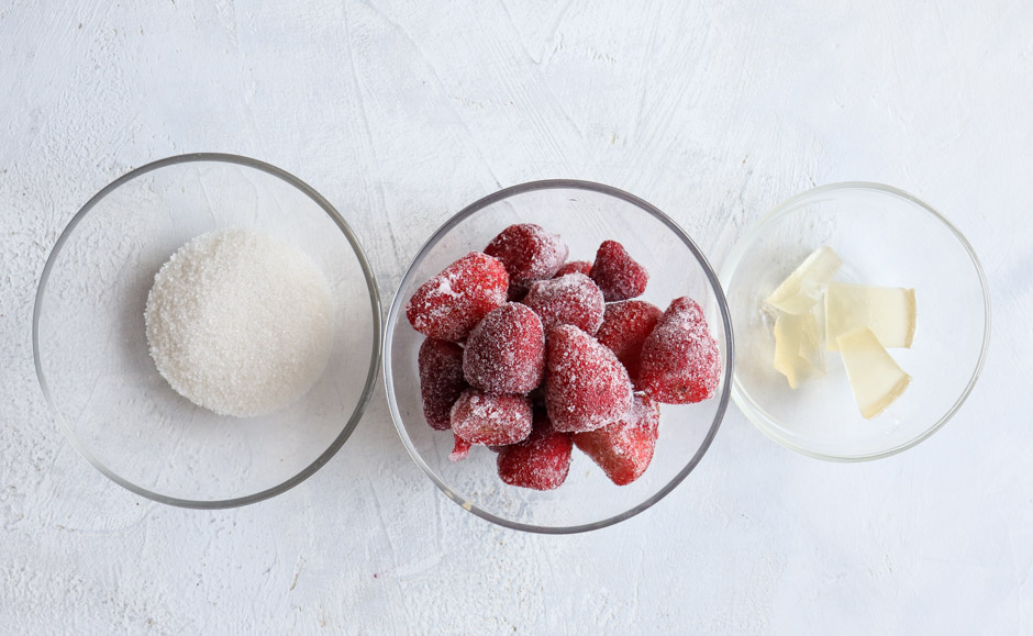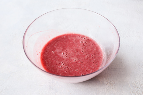 Сначала нужно приготовить начинку. Будем делать конфи на желатине. Понадобятся всего три ингредиента: ягодное пюре, сахар и желатин. Замочите листовой желатин в холодной воде. Я использовала замороженную клубнику. Нужно ее разморозить,а затем пробить блендером, чтобы получилось превратить ее в пюре.