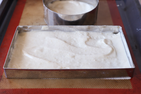 Вручную вмешайте муку в бисквит. Затем распределите тесто в форме. Я пекла бисквит в кольце (кроме пирожных я собирала торт) и в прямоугольной форме. Распределите тесто, так чтобы его толщина получилась везде одинаковой. Выпекайте в духовке при 180 С около 15-20 минут.