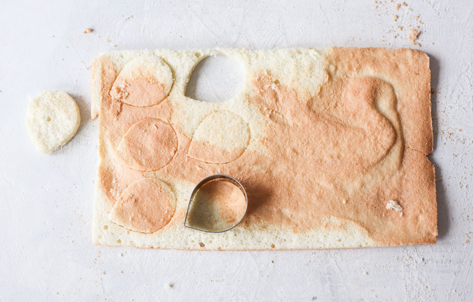 Когда бисквит зарумянится, вытаскивайте его из духовки. Дайте полностью остыть при комнатной температуре. После этого достаньте из формы и вырежьте основы. Я собирала пирожные в форме сердце, но вырубки сердце под рукой не было, поэтому вырезала капли.