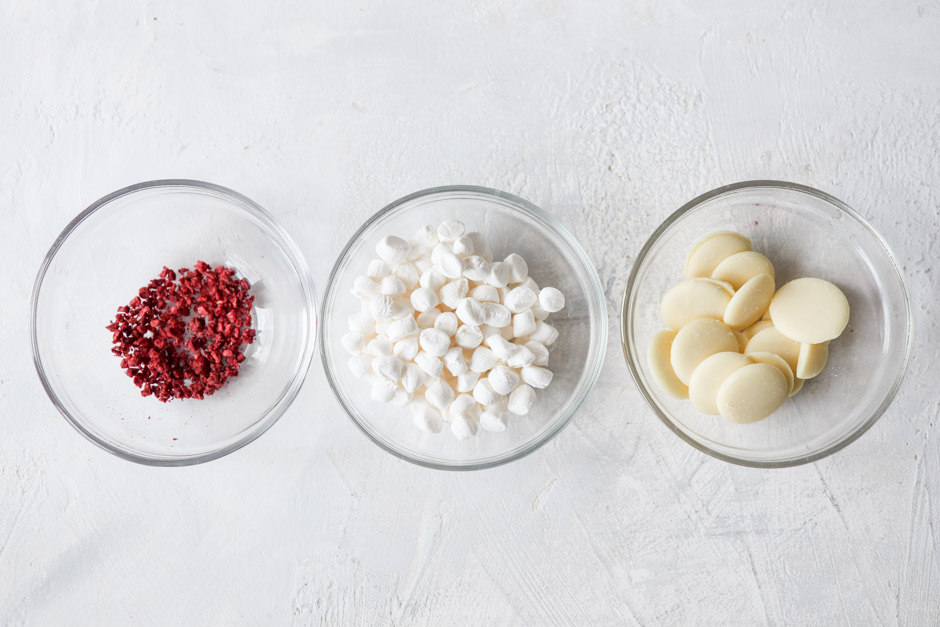 В рецепте торта "Три шоколада", я делала хрустящий слой, а в этом рецепте предлагаю сделать жевательный слой с маршмеллоу. Для этого понадобится белый шоколад, маршмеллоу и сушеные кусочки малины.