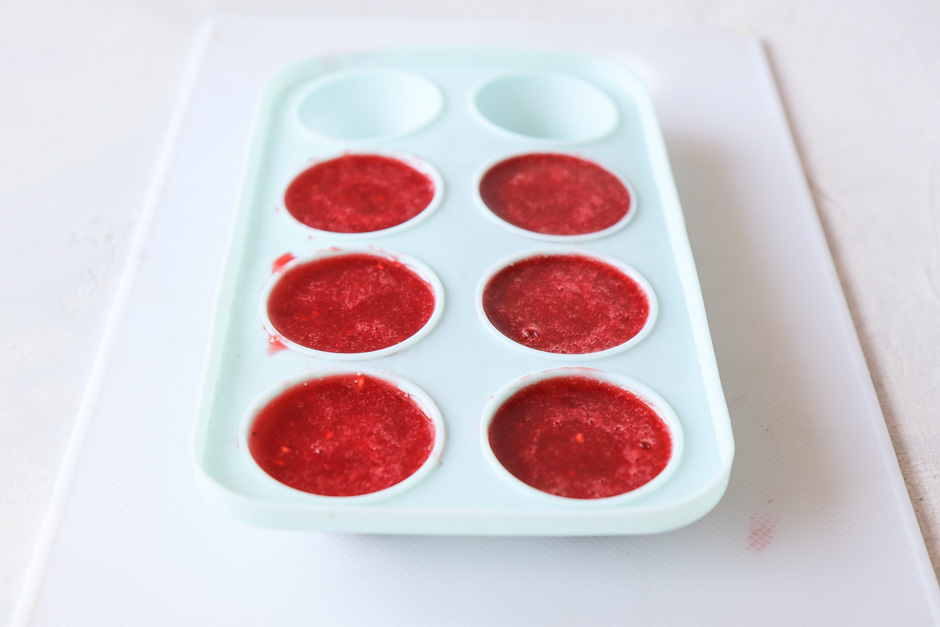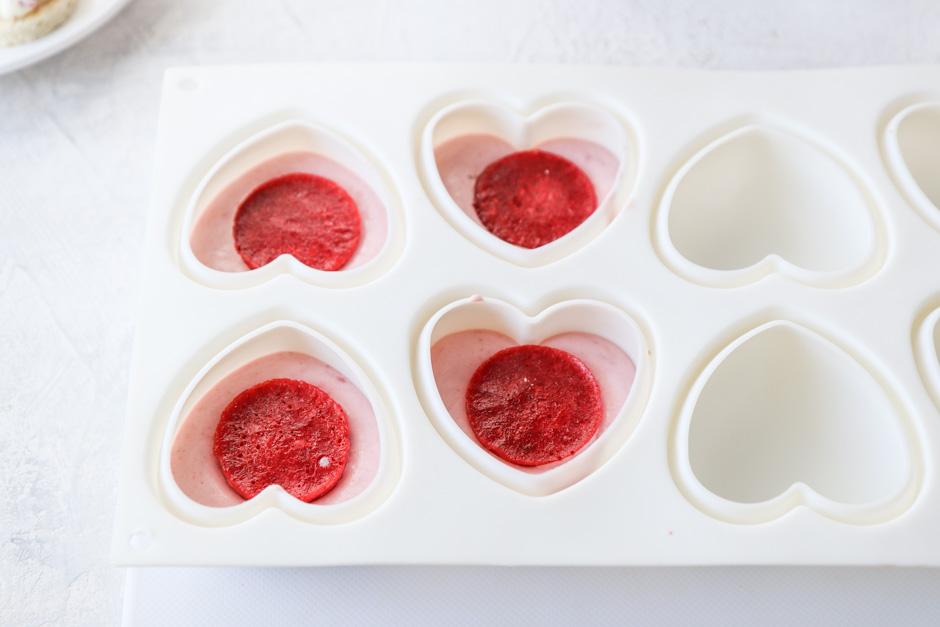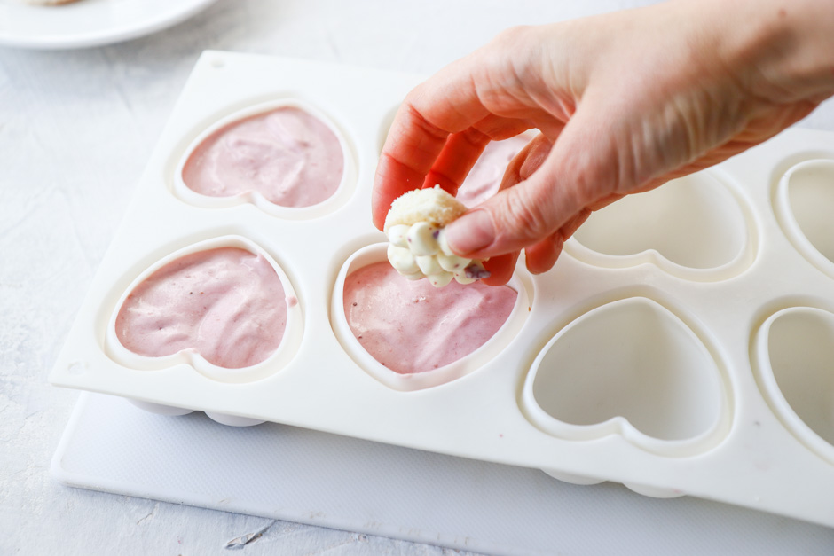 Перелейте начинку в формы. Для пирожных я часто использую силиконовую форму для кейкпопсов. Заморозьте конфи. Такие маленькие полусферы, заморозятся за пару часов.