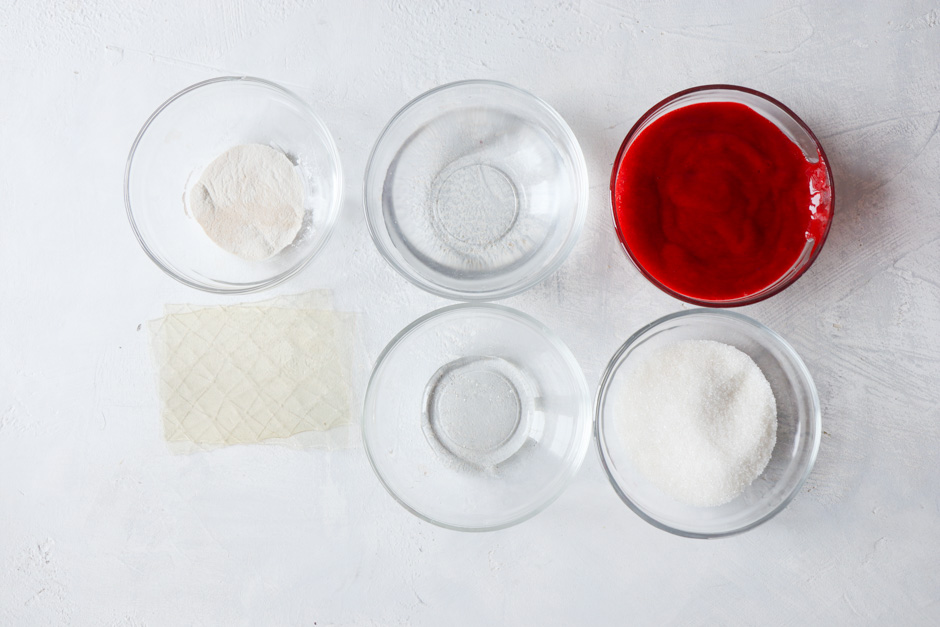 Отмерьте на весах сахар, сироп глюкозы, фруктовое пюре (я взяла малиновое пюре, заранее процедила через сито, чтобы избавиться от косточек), воду, желатин и пектин NH. Заменить сироп глюкозы можно патокой. Если нет ничего, тогда делайте на сахаре, но столько блеска не будет. Также нельзя ничем заменить пектин NH. нужен именно он.