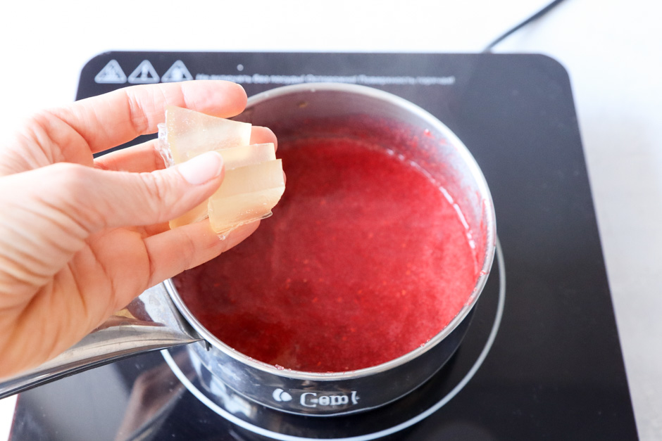 В горячее пюре добавляем отжатый желатин или желатиновую массу. Желатин растворится под действием температуры, размешайте конфи.