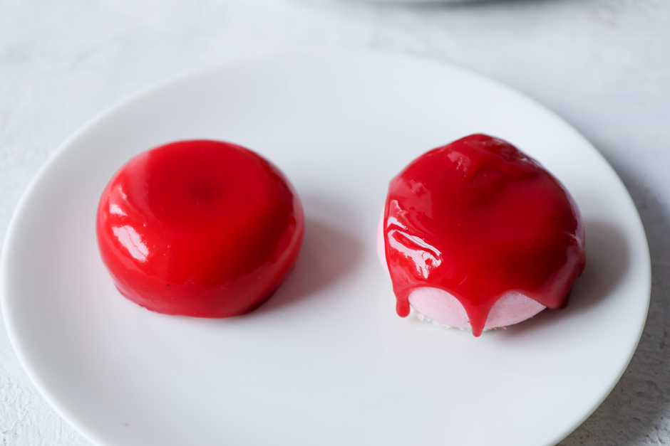 В отличие от зеркальной глазури на шоколаде, это сразу схватывается и превращается в слой мармелада. Если температура глазури будет ниже 40 С, то есть вероятность, что глазурь равномерно не распределится. Ниже для примера я залила одно пирожное горячей глазурью 48 С, а второе пирожное - глазурью 35 С. Так что будьте внимательны. Если глазурь излишне остынет, прогрейте ее. Вкус глазури - прекрасное преимущество перед другими видами глазури. У нее насыщенный вкус пюре, не излишнее количество сахара. Для всех фруктовых и ягодных десертов рекомендую использовать эту глазурь.