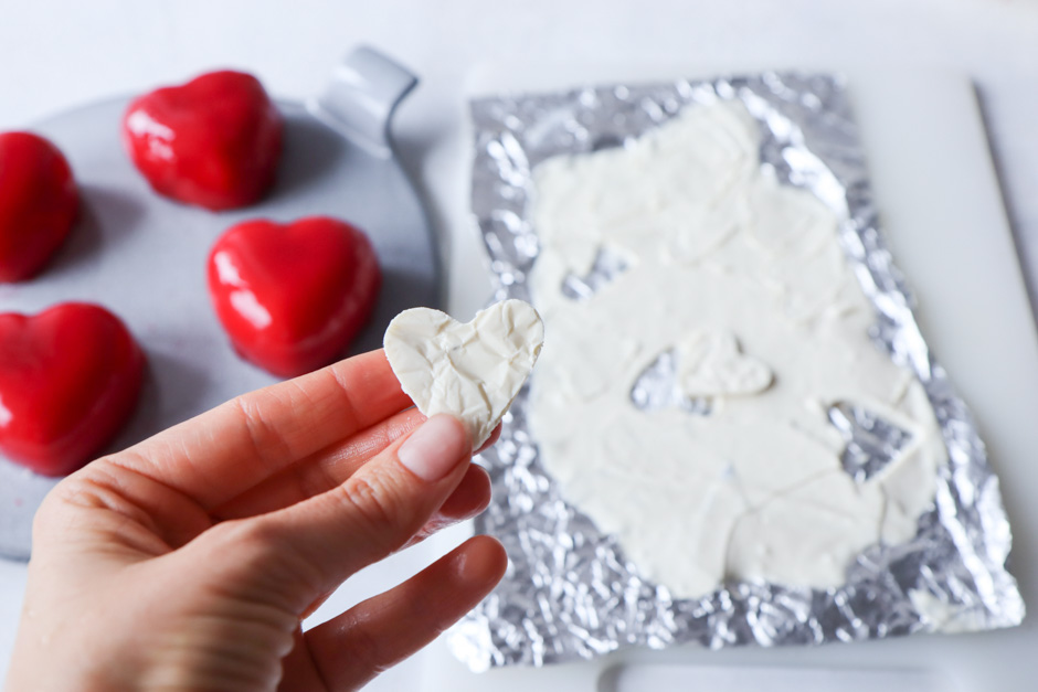 Для декора пирожных я сделала сердца из белого шоколада. Из оборудования мне понадобились лишь фольга и вырубка сердце (для бисквита она была маленькой). Шоколад я затемперировала на плите. Вы можете воспользоваться методом темперирования шоколада на замороженных овощах.