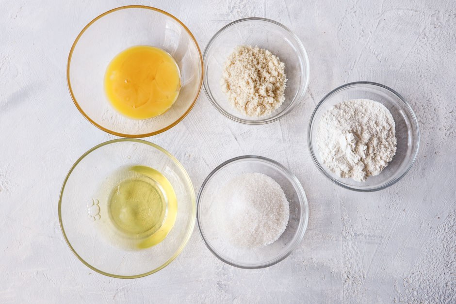 Пока замораживается начинка переходите к бисквиту. В муссовых десертах бисквит - это основа пирожного, его вкус на втором плане. Поэтому готовим простой в исполнении, но воздушный бисквит. Вам понадобятся белок, желток, сахар, пшеничная и миндальная мука. Если миндальной муки нет, размолите орехи или замените пшеничной мукой в том же количестве. Сразу ставьте разогреваться духовку до 180 С.