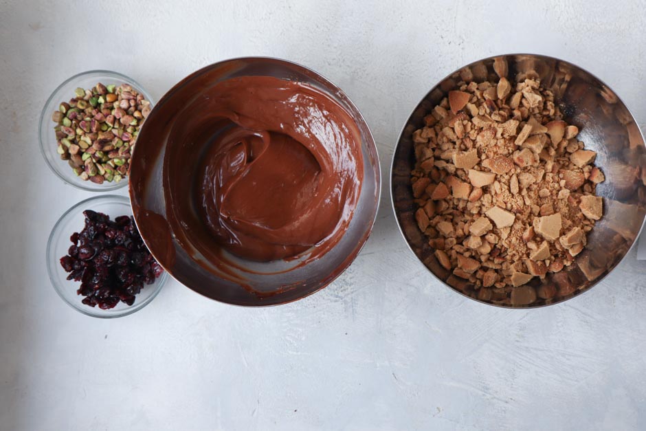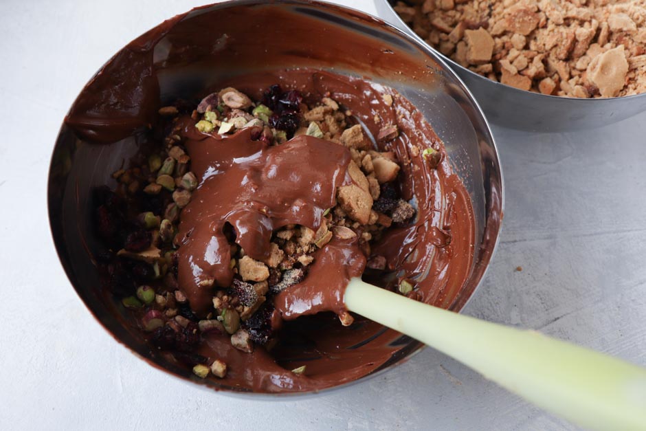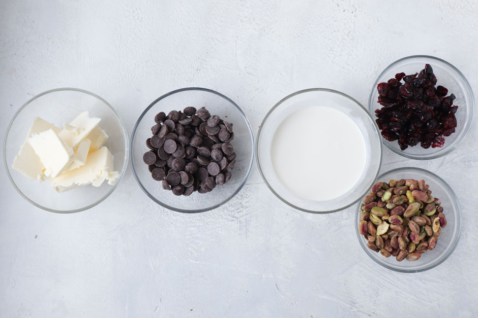 Добавьте в ганаш крупные кусочки печенья, клюкву и фисташки. Добавлять ингредиенты, лучше всего, поэтапно, тщательно перемешивая, при добавлении каждой составляющей десерта. Так вы сможете не переборщить с ингредиентами и лучше отследить их количество именно под ваш вкус!