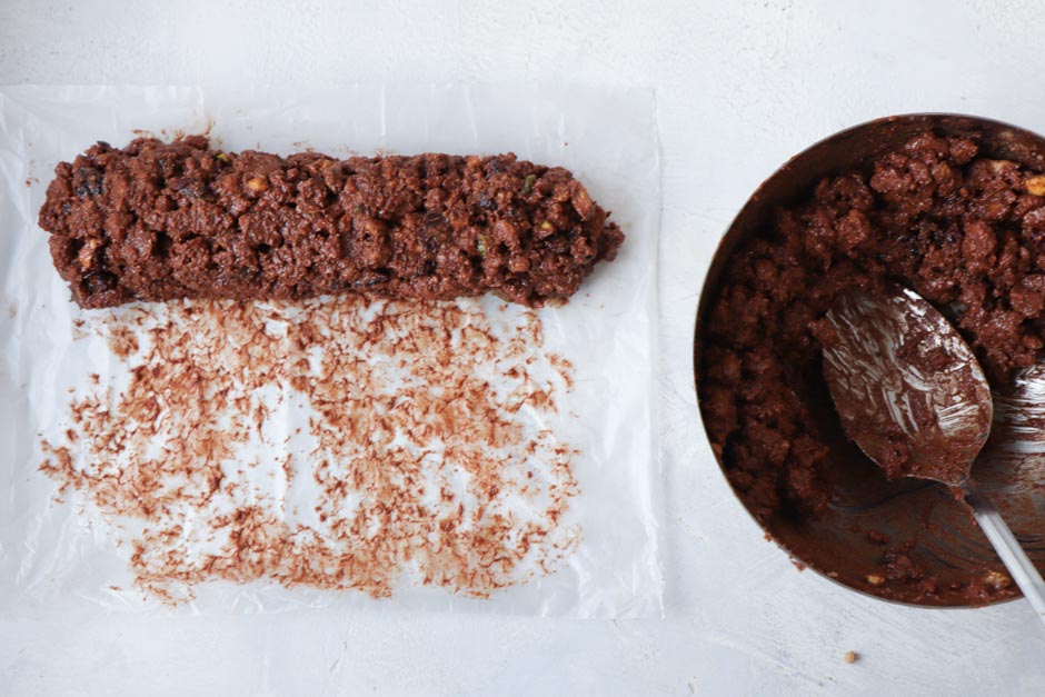 После того, как все ингредиенты добавлены и тщательно перемешаны, можно приступать к формированию нашей колбасы. Пищевая пленка слишком тонкая, поэтому я использовала полиэтиленовый пакетик. В этот мешочек я положила шоколадную массу, распределила её, скрутила в колбаску и отправила в холодильник.