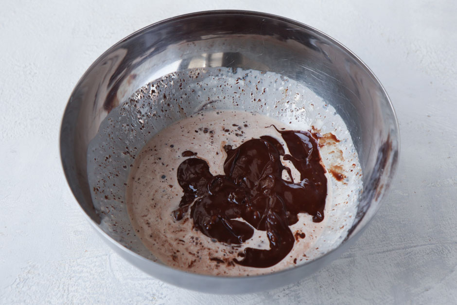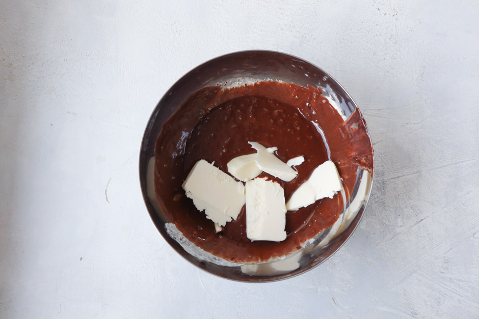 После того, как сливки вылили на шоколад, будущий ганаш нужно обязательно пробить блендером. Это делается для того, чтобы объединить жир, имеющийся в шоколаде, с молекулами воды, содержащимися в сливках. После получения однородной массы, добавьте сливочное масло и снова пробейте всё блендером.